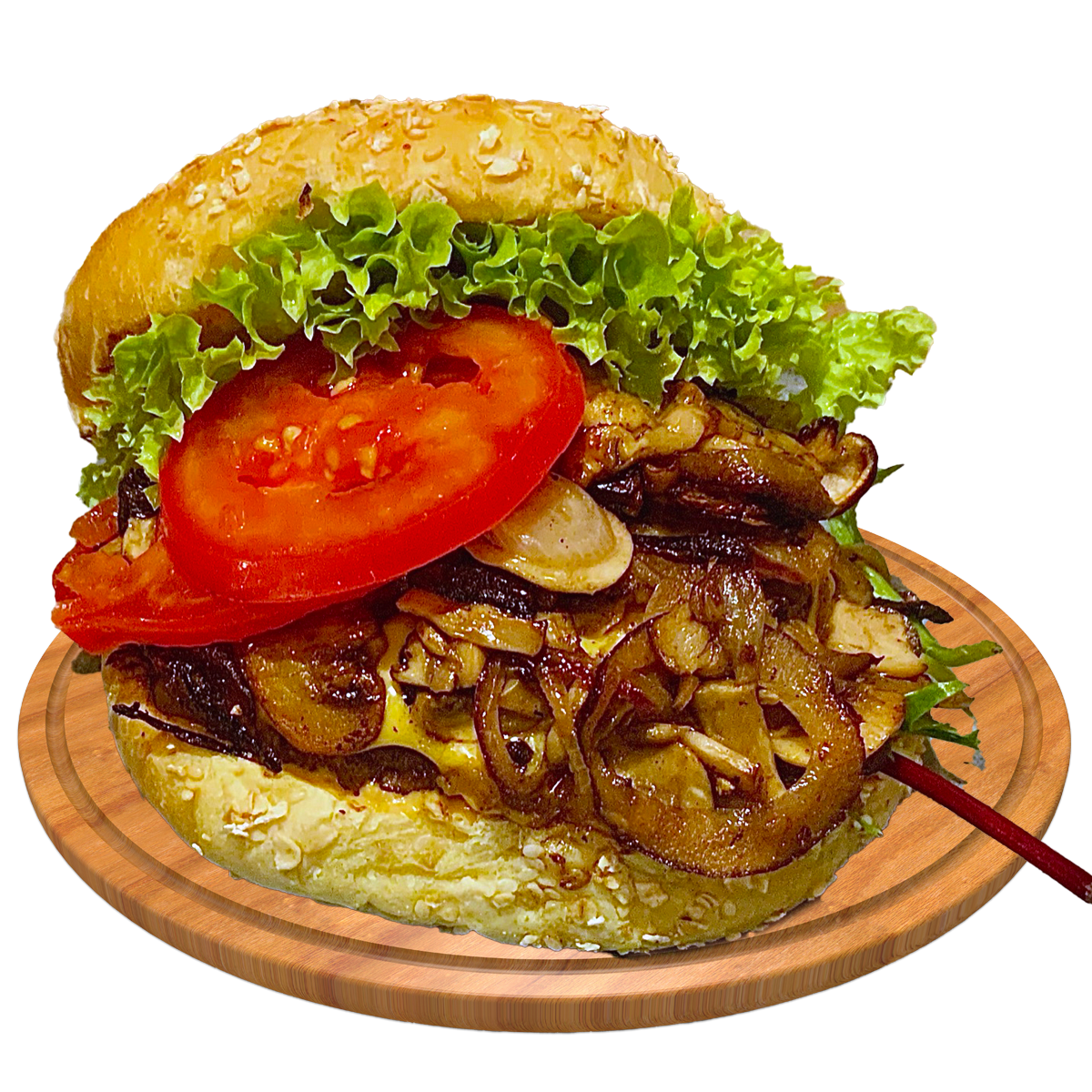 100% SAFTIGES BEEF, GURKEN-RELISH, BURGERSAUCE, CHEDDAR CHEESE, BLATTSALAT & WILDKRÄUTER, GEGRILLTE CHAMPIGNONS, ROTE ZWIEBELN